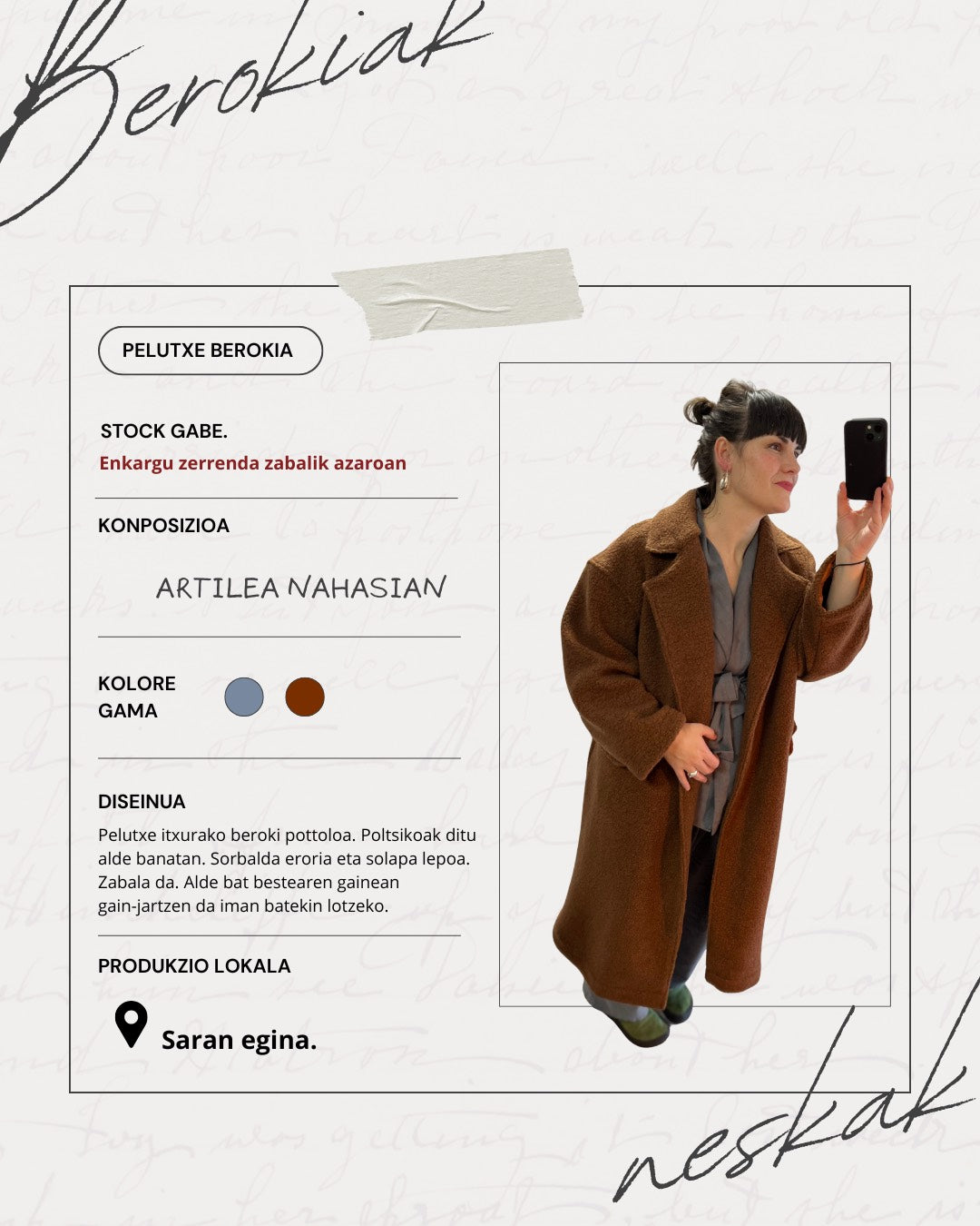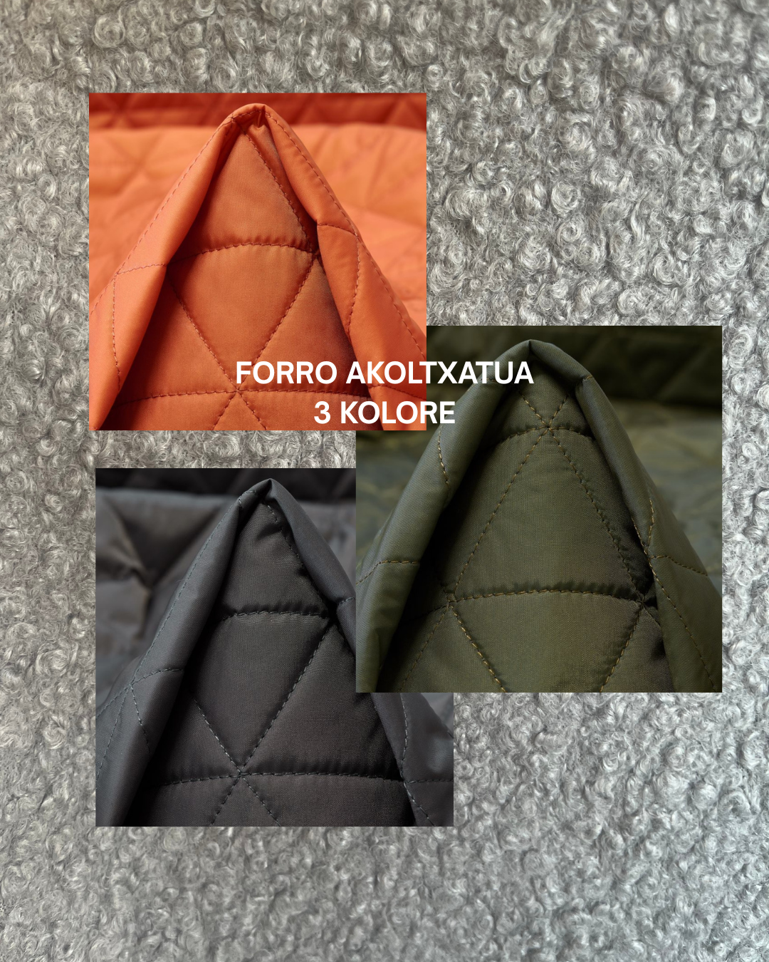 Forro eta rebersoak akoltxatuan eginak ditu. Berokia gris edo marroian egiteko aukera dago.